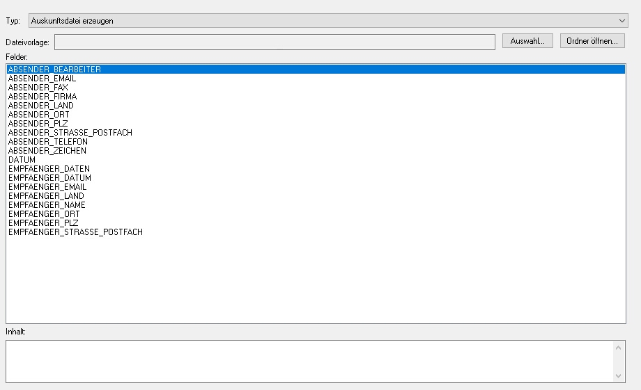 Felder: Das Programm probiert die Absender- und Empfängerdatenfelder mit den im Programm gespeicherten Daten zu füllen, im Eingabefeld Inhalt können diese bearbeitet werden. Das Feld EMPFAENGER_DATUM (Datum der Anfrage durch die Person) wird immer zurückgesetzt und muss manuell eingetragen werden.