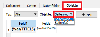 Durch Ziehen am Spaltenkopf dann das Eingabefeld zum Bearbeiten vergrößert werden. Durch einen Klick in die entsprechende Spalte kann das Feld bearbeitet werden, das Layout kann im Register Datenfeld im unteren Teil des Dialogs eingestellt werden. Anstelle der Textvariable kann z.B. auch ein manueller Text eingegeben werden. Unter Variable kann eine Programmvariable hinzugefügt werden (Schalter Einfügen).