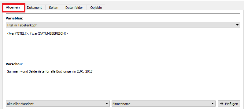 b) Bei bestimmten Ausgaben kann der Titel im Register 'Allgemein' festgelegt werden: